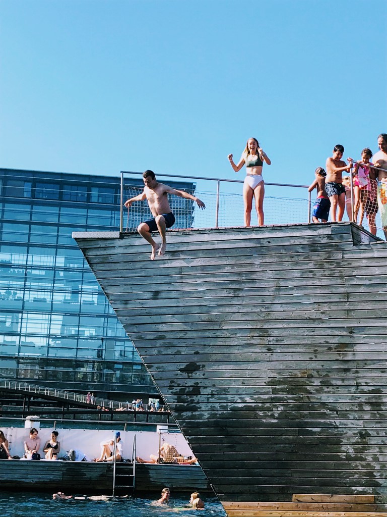 Islands Brygge is filled with plenty to do: filled with both land areas and harbor baths. The space takes up both sides of the harbor, giving space for all the locals to enjoy the sun. On one side of the harbor, there are little baths for splashing and swimming for small children, along with a bath with a big, wood, man-made cliff that all ages can jump off of. On the other side, there is a giant wooden slide, along with a big pier that everyone can use to soak up the sun.